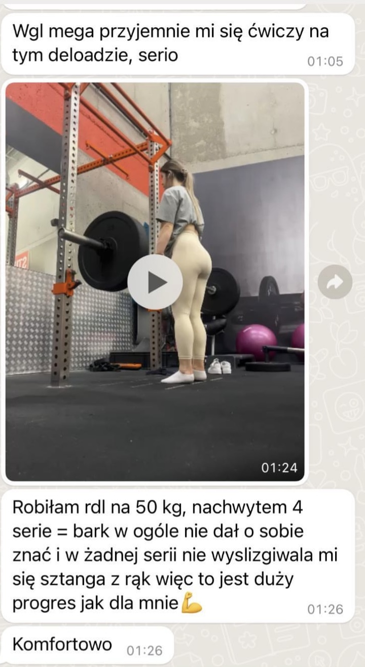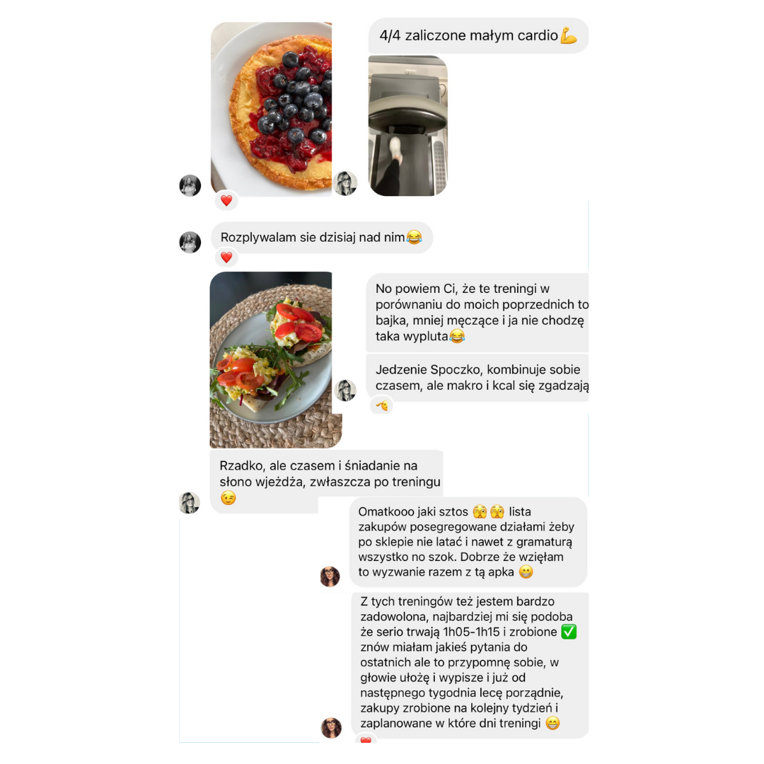 - Analiza progresu w postaci raportu co 1 tydzień, feedback głosowy, analiza pomiarów cm krawieckim i zdjęć sylwetki