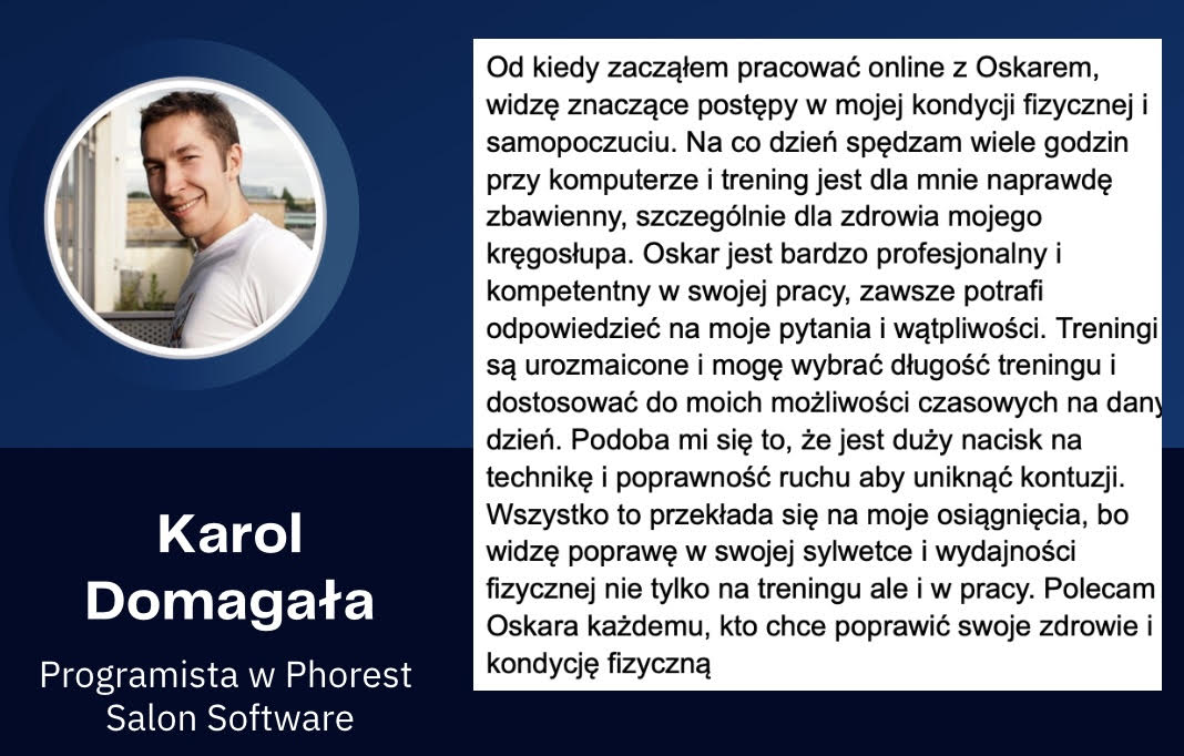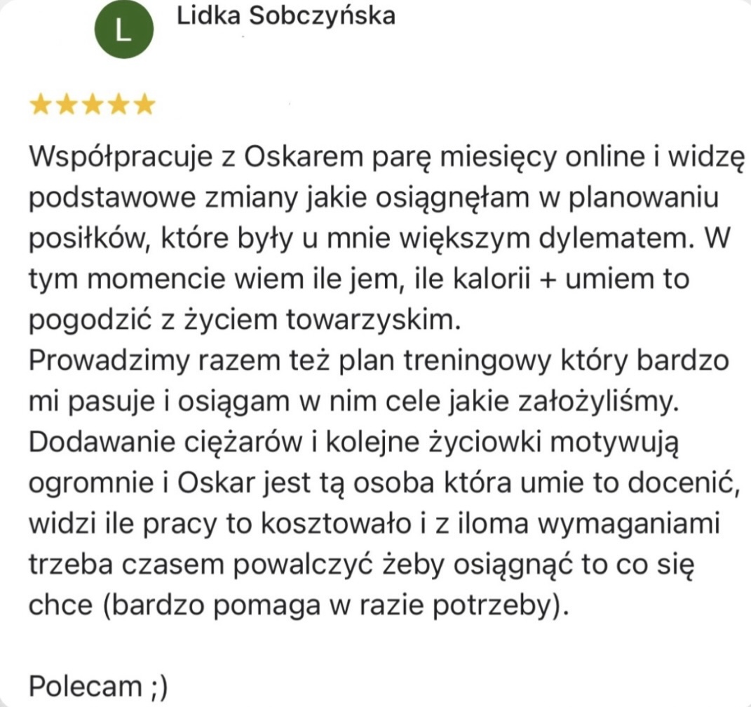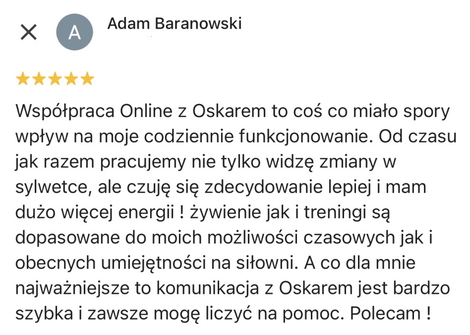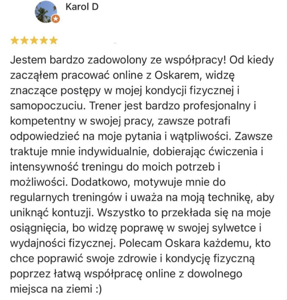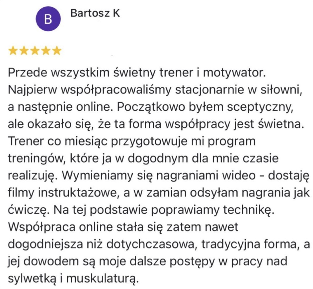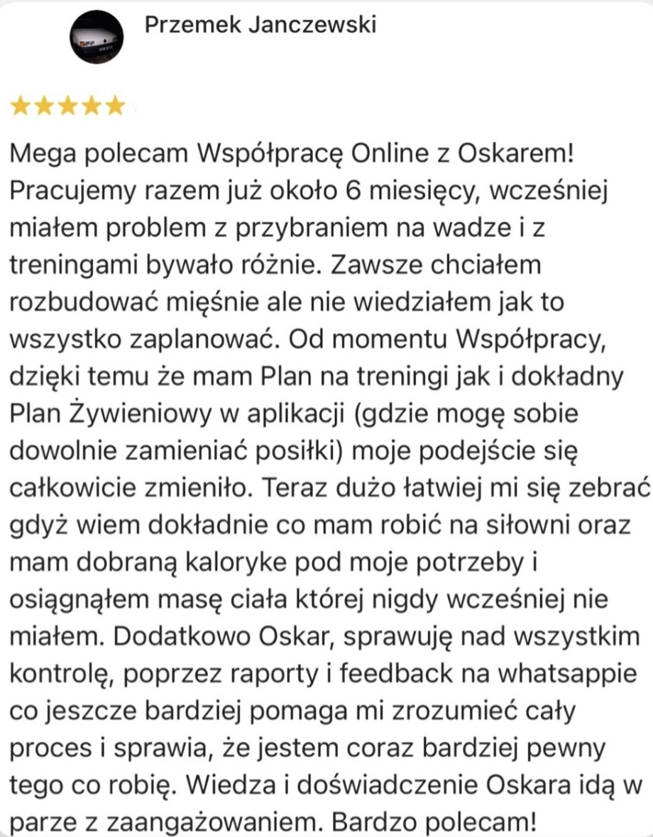 Pracowałem 6 lat jako Trener Personalny na siłowni i od stycznia 2023 pracuję już w 100% zdalnie jako Trener Online wykorzystując swoje doświadczenie w pracy z klientami. Współpracuję z podopiecznymi 1:1 na zasadzie Współpracy Online, gdzie zajmuję się planowaniem całego procesu zmiany sylwetki, nawyków oraz performance’u aby klient osiągnął swój pożądany rezultat.