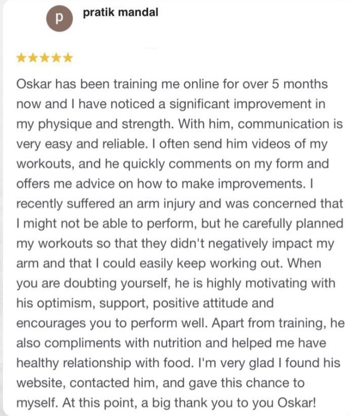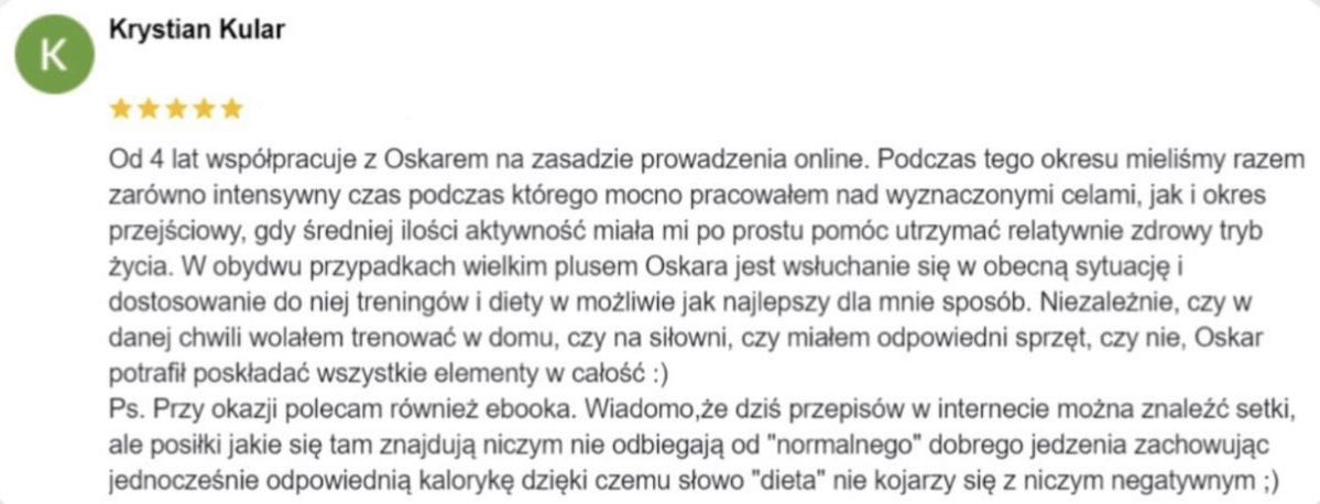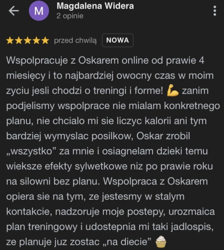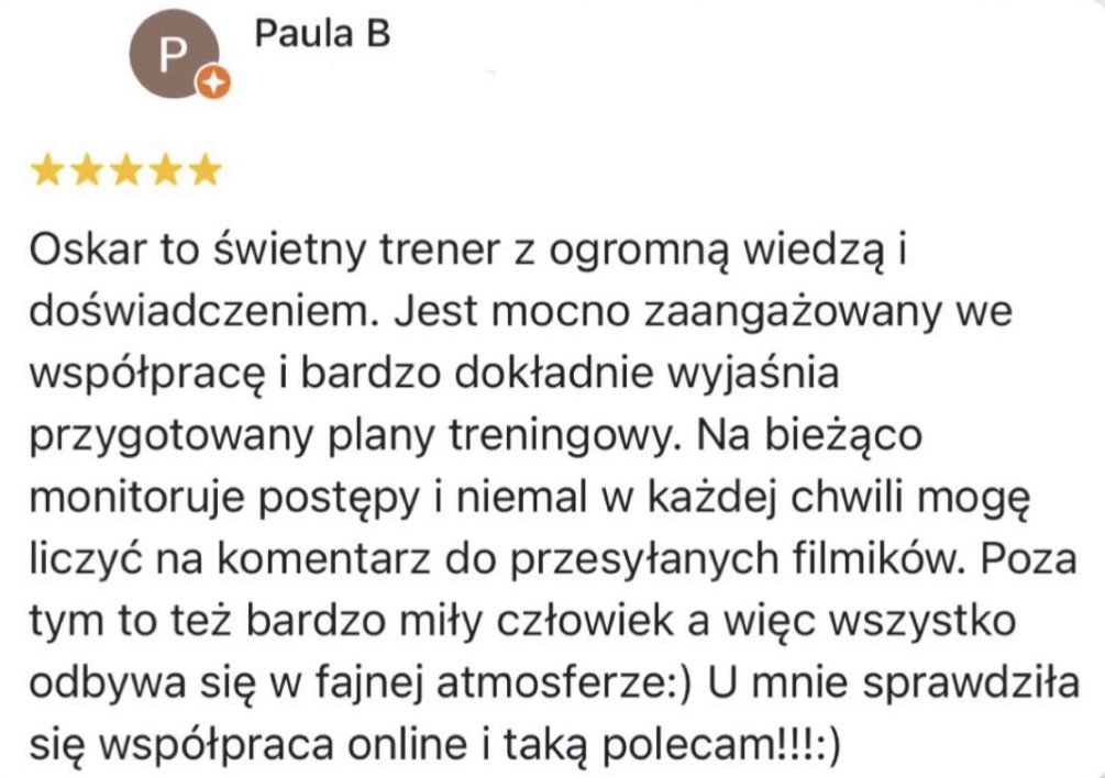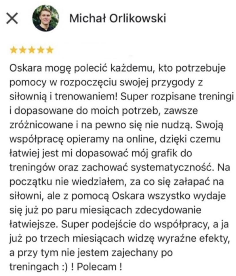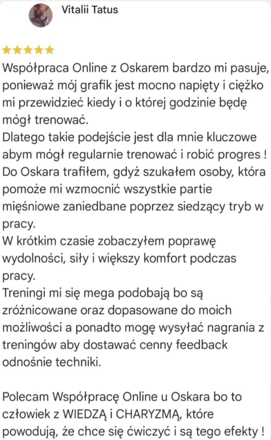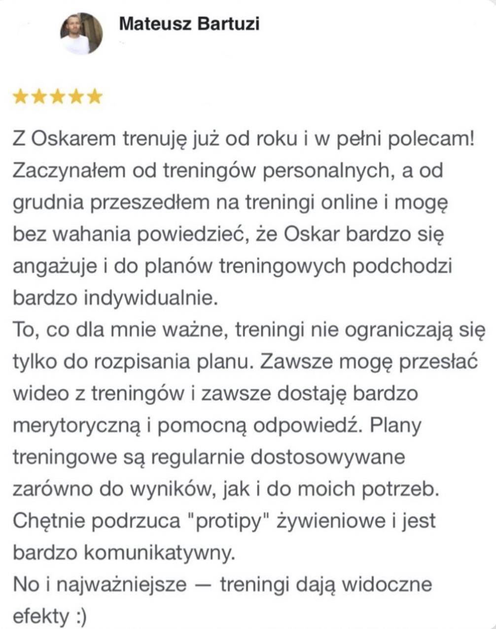 Pracowałem 6 lat jako Trener Personalny na siłowni i od stycznia 2023 pracuję już w 100% zdalnie jako Trener Online wykorzystując swoje doświadczenie w pracy z klientami. Współpracuję z podopiecznymi 1:1 na zasadzie Współpracy Online, gdzie zajmuję się planowaniem całego procesu zmiany sylwetki, nawyków oraz performance’u aby klient osiągnął swój pożądany rezultat.
